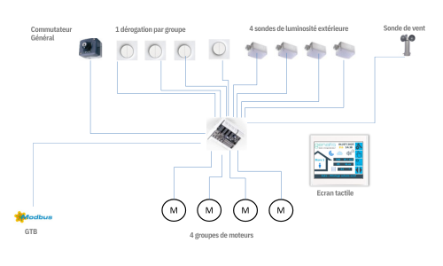 - Jusqu’à 20 groupes de protections solaires pilotables